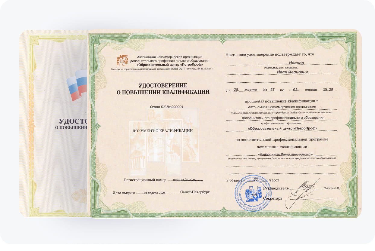 Заключительным этапом служит аттестация, необходимая для подтверждения приобретенных студентами знаний, навыков и компетенций. При успешных результатах выпускникам "ПетроПроф" выдается диплом о профессиональном образовании. Наличие этого документа требуется и при трудоустройстве, и при дальнейшем ведении деятельности, и при развитии в рамках профессии.